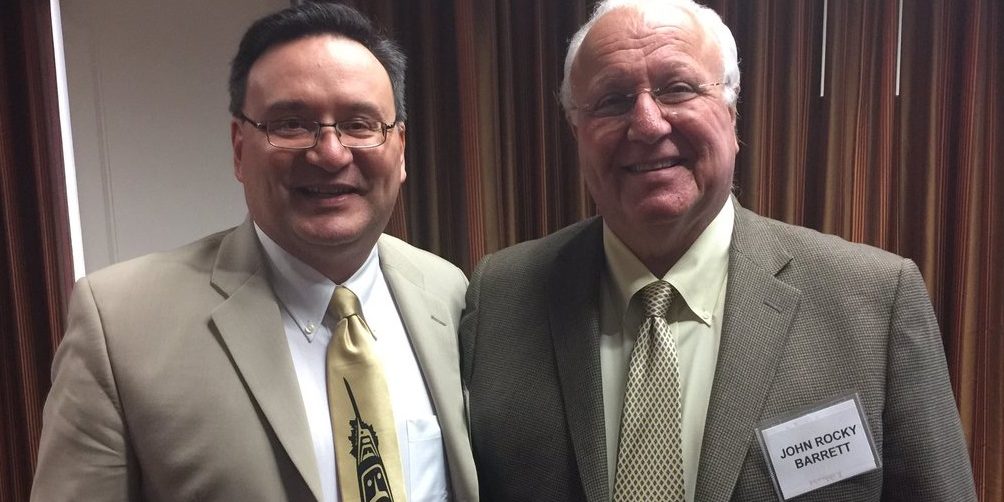 Wayne Garnons-Williams speaks about economic development during a panel discussion at the 30th annual Sovereignty Symposium, held Wednesday at the Skirvin Hilton Hotel. Garnons-Williams is the director of the International Inter-tribal Trade and Investment Organization. Sitting behind him are state Rep. Meloyde Blancett, D-Tulsa, left, Delon Chan with the Canadian consulate general’s office, Cornell Wesley with the U.S. Department of Commerce, Dakota Cole with the Chickasaw Nation, and Kevin Osborn with U.S. Sen. James Lankford’s office. (Photo by Molly M. Fleming) Feature photo of Citizen Potawatomi Nation Chair, John Barrett and IITIO Chair, Wayne Garnons-Williams.